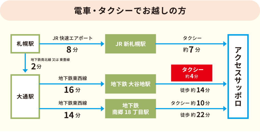 ・地下鉄南北線または東豊線で「大通駅」へ(2分)、地下鉄東西線へ乗り換え「大谷地駅」へ向かう(16分)